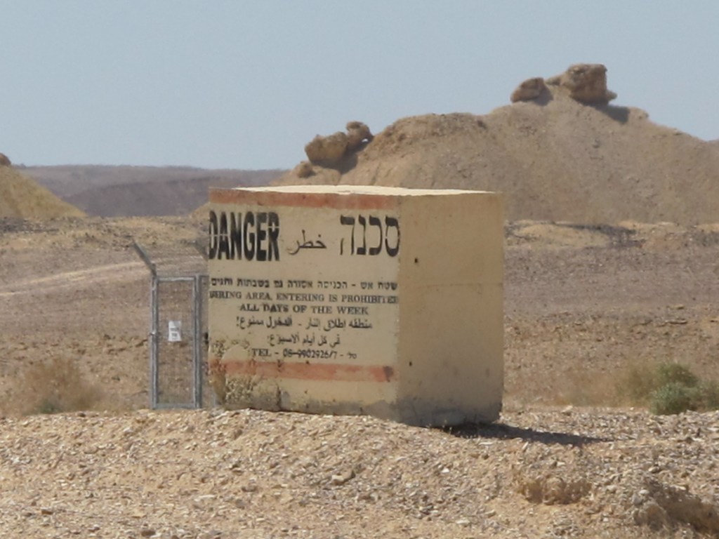 Warning Block as a signboard: “Danger: Firing zone, Entrance is Forbidden also in Saturdays and Holidays” alongside Highway 90, south Arava Desert. (Efrat Hildesheim, 2017).
