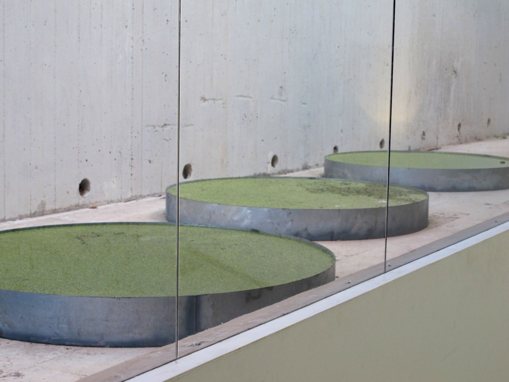 Lemnaceae is a garden installation that was displayed in the Herzliya Museum of Contemporary Art at the exhibition Other People’s Problems: Conflicts and Paradoxes, curated by Doreet Levitte Harten and Dalia Levin in the fall of 2013. The work was composed of eight metal water ponds (110-120 cm. Diameter / 15 cm. height), Duckweed/water lenses (Lemnaceae), Mosquitofish (Gambusia affinis), and pieces of waste and garbage (cigarette butts, cans, snacks' wrappers, bottle caps). It was situated in a sunken, narrow courtyard that the public could not reach, between the museum and the street above. The spectators, viewing the work from behind great glass windows along a steep staircases hallway, could not fully perceive the work as a whole because of the changing viewpoint along the staircase.